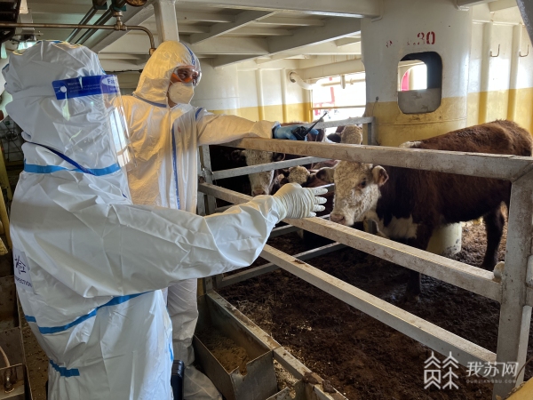 據了解,該輪從新西蘭納皮爾港出發,歷經15天到達鹽城大豐港,船上運載著荷斯坦、赫里福德、安格斯等種牛5240頭,總價值超1億元。由于活牛的特殊性,滯留港口時間越長,就越容易造成活牛死亡,需要在最短時間內完成卸載。在接到“海洋使者”輪靠泊申請后,鹽城出入境邊防檢查站就立即著手研究制定特殊通關方案,第一時間與聯檢部門和代理公司取得聯系,及時掌握船舶、船員、載運種牛及疫情防控等相關情況。