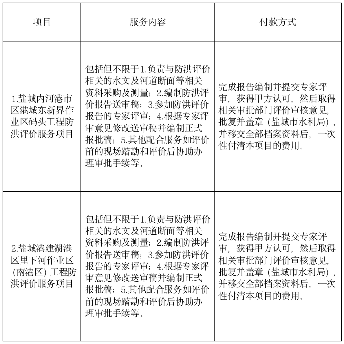 一、江蘇鹽城港水上服務(wù)投資發(fā)展有限公司就鹽城內(nèi)河港市區(qū)港城東新界作業(yè)區(qū)碼頭工程及鹽城港建湖港區(qū)里下河作業(yè)區(qū)(南港區(qū))工程防洪評(píng)價(jià)服務(wù)項(xiàng)目進(jìn)行公開(kāi)招標(biāo),歡迎符合條件的潛在投標(biāo)人前來(lái)報(bào)名參加。