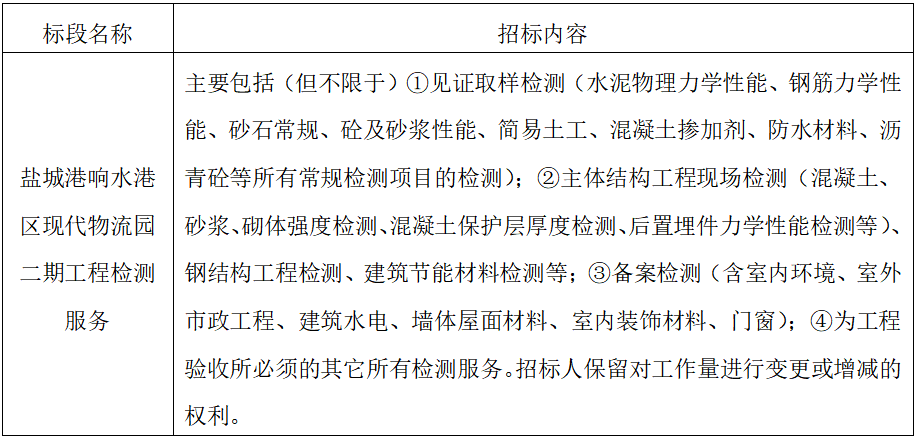 8、項目標段劃分:鹽城港響水港區(qū)現(xiàn)代物流園二期工程檢測服務(wù)共為1個標段,標段信息如下: