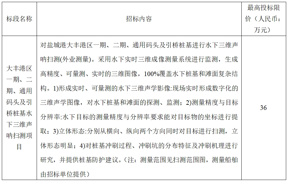 (5)項目標段劃分:大豐港區(qū)一期、二期、通用碼頭及引橋樁基水下三維聲吶掃測項目共劃分1個標段,標段信息如下: