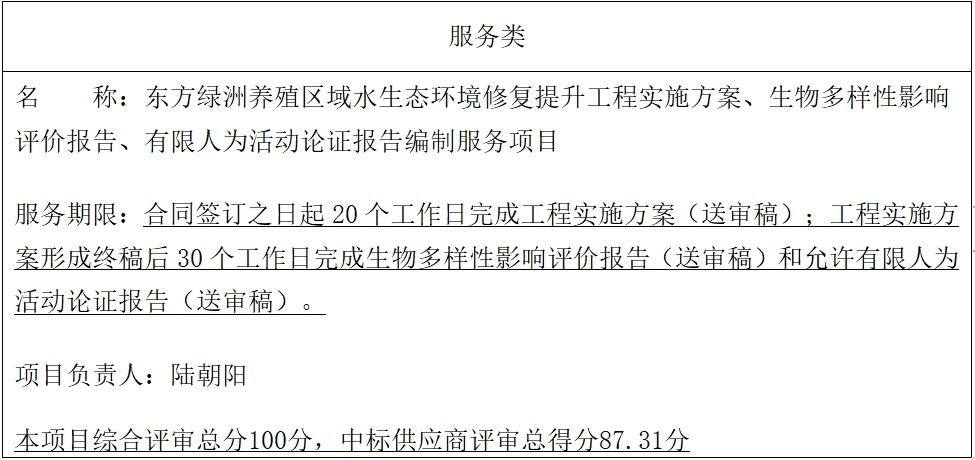 二、項(xiàng)目名稱:東方綠洲養(yǎng)殖區(qū)域水生態(tài)環(huán)境修復(fù)提升工程實(shí)施方案、生物多樣性影響評(píng)價(jià)報(bào)告、有限人為活動(dòng)論證報(bào)告編制服務(wù)項(xiàng)目