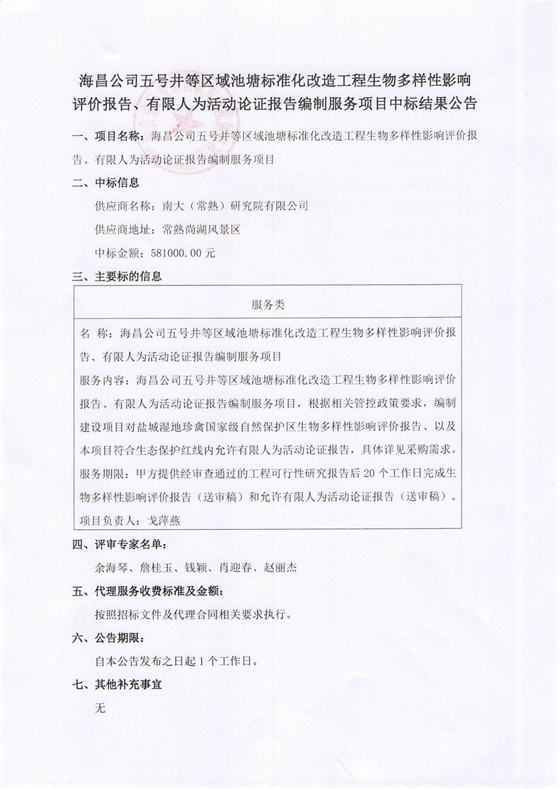 海昌公司五號井等區域池塘標準化改造工程生物多樣性影響評價報告、有限人為活動論證報告編制服務項目中標結果公告