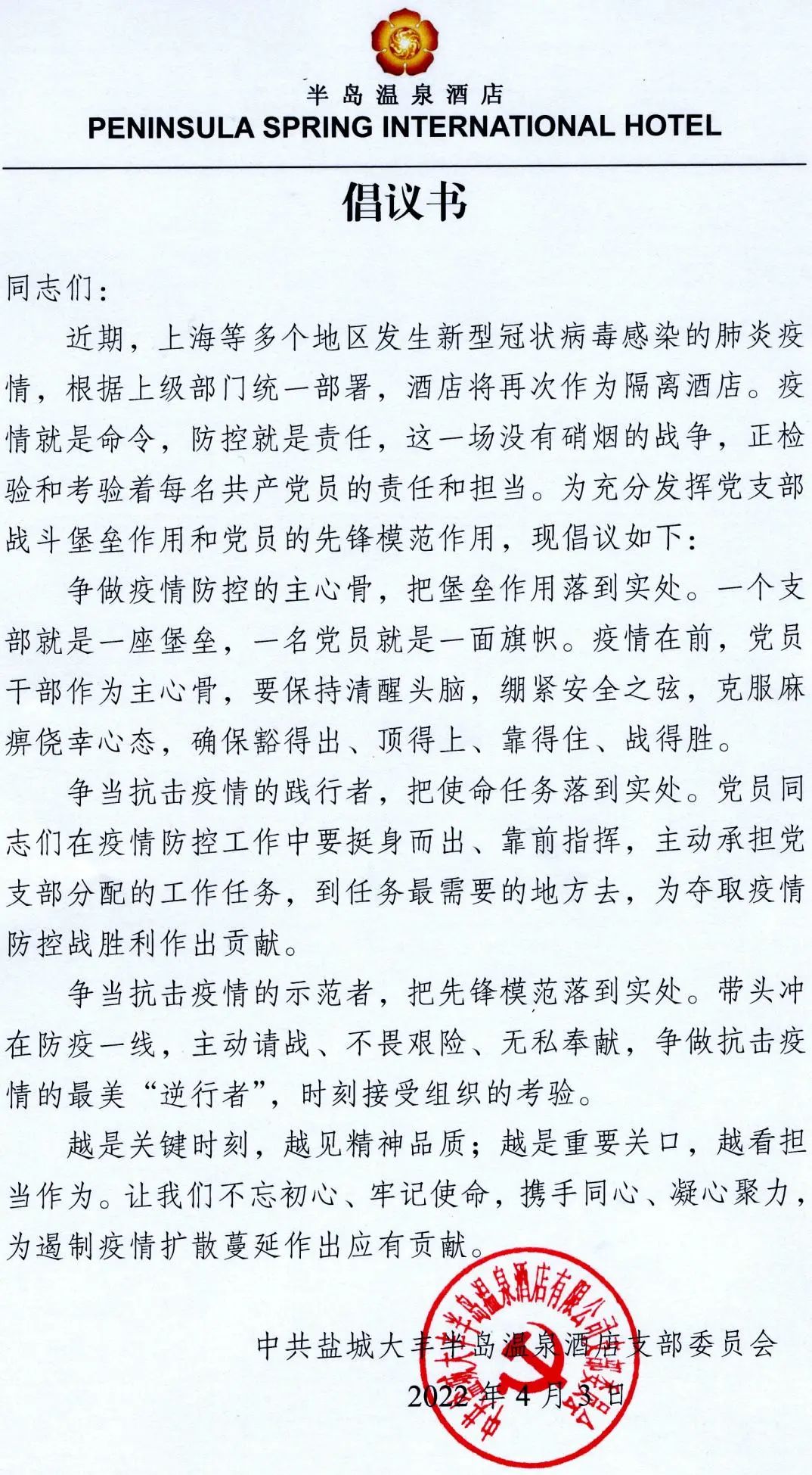 “我請愿:自愿參加酒店一線防疫工作,充分發揮黨員先鋒帶頭作用,堅決打贏疫情防控阻擊戰?!薄拔艺堅福鹤鰢烂骷o律的踐行者,做擔當履職的戰斗員,請領導批準我參與此次隔離任務。”“我是一名入黨積極分子,我志愿參與酒店疫情防控任務,請讓我上一線”……一封封按著紅色手印的《請戰書》被遞交到鹽城港文旅集團旗下半島溫泉酒店黨支部。