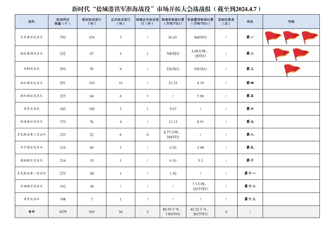 1.累計拜訪客戶數量3479家:其中大豐港區突擊隊750家,巾幗突擊隊293家,響水港區突擊隊291家,多式聯運第一突擊隊275家,多式聯運第二突擊隊235家,航運集團突擊隊232家,射陽港區突擊隊225家,阜寧港區突擊隊216家,建湖港區突擊隊216家,青年突擊隊198家,亭湖港區突擊隊192家,黨員突擊隊183家,濱海港區突擊隊173家。