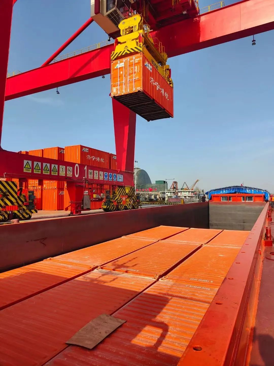 4月9日滿載集裝箱運輸船“港航潤楊5010”號已經從山東濟寧港抵達亭湖港區,首批業務完成集裝箱68TEU,預計全年可完成“散改集”吞吐量1000TEU。