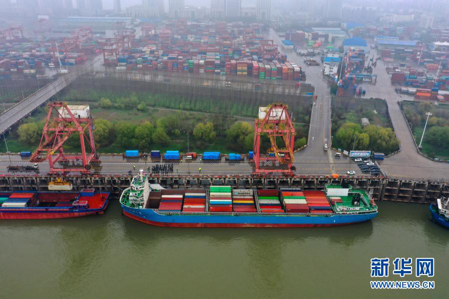 2月28日,停靠在碼頭的“漢海5號”準備首航駛往上海洋山港(無人機照片)。新華社發(fā)(趙軍 攝)