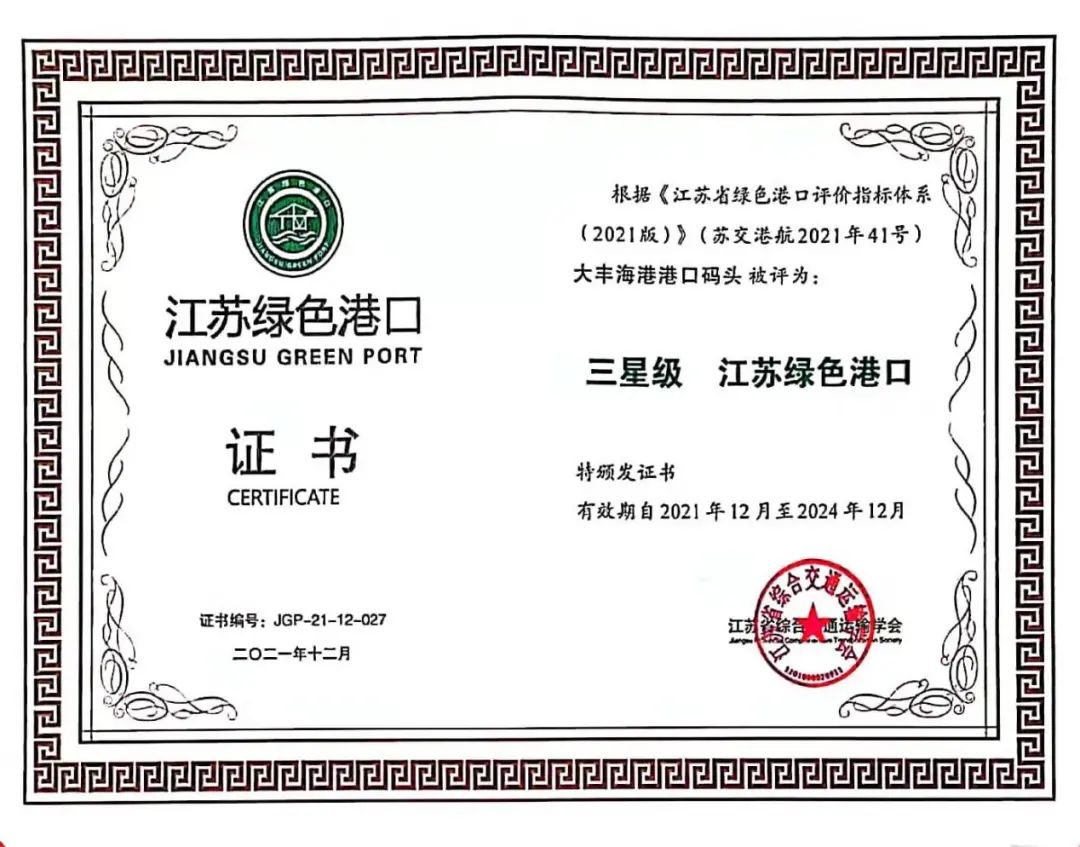 12月18日,2021年度江蘇省星級(jí)綠色港口授牌儀式在南京舉行,由鹽城港大豐港區(qū)港口公司申報(bào)的大豐海港港口碼頭獲得“三星級(jí)綠色港口”殊榮。