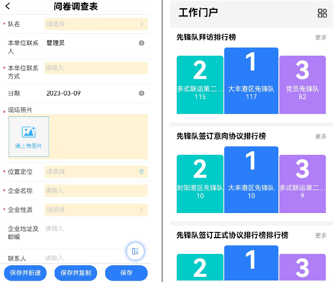 該系統(tǒng)集成了在線問(wèn)卷、定位打卡、成果評(píng)比、統(tǒng)計(jì)分析等功能。與傳統(tǒng)的紙質(zhì)問(wèn)卷相比,該系統(tǒng)減少了表格錄入、匯總上報(bào)、統(tǒng)計(jì)分析等環(huán)節(jié),實(shí)現(xiàn)了全過(guò)程無(wú)紙化、自動(dòng)化操作,極大地提高了工作效率。同時(shí),該系統(tǒng)還具備在線成果評(píng)比等功能,實(shí)時(shí)展現(xiàn)各先鋒隊(duì)工作成績(jī),為進(jìn)一步激發(fā)各先鋒隊(duì)你追我趕的戰(zhàn)斗激情提供了技術(shù)支撐。