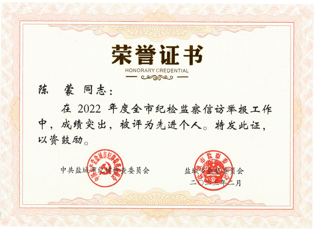 近日,中共鹽城市紀(jì)委、鹽城市監(jiān)委發(fā)布關(guān)于表?yè)P(yáng)2022年度全市紀(jì)檢監(jiān)察信訪舉報(bào)工作先進(jìn)集體和先進(jìn)個(gè)人的決定,集團(tuán)紀(jì)檢監(jiān)察第三派駐組副組長(zhǎng)、鹽城港引航站黨總支書記、鹽城港拖輪服務(wù)公司支部書記陳蒙同志榮獲“2022年度全市紀(jì)檢監(jiān)察信訪舉報(bào)工作先進(jìn)個(gè)人”榮譽(yù)稱號(hào)。