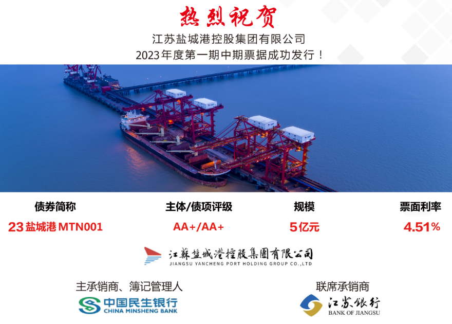 3月20日,鹽城港集團(tuán)2023年度第一期中期票據(jù)發(fā)行成功,金額5億元,發(fā)行利率4.51%。集團(tuán)本期中期票據(jù)的成功發(fā)行充分反映了投資機(jī)構(gòu)對(duì)鹽城港集團(tuán)發(fā)展的高度認(rèn)可,進(jìn)一步提振了資本市場(chǎng)對(duì)鹽城港集團(tuán)發(fā)展的信心。