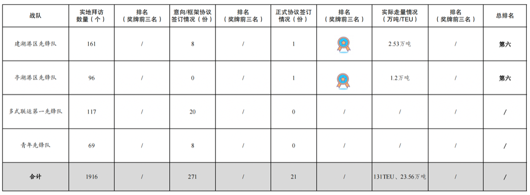 活動開展以來,累計拜訪客戶數量1916家,簽訂意向/框架協議數量271份,簽訂正式協議21份,實際走量131TEU、23.56萬噸。