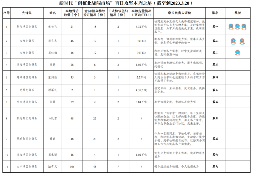 第三名:濱海港區先鋒隊 高鵬(拜訪客戶28家,簽訂意向協議8份,簽訂正式協議2份,實際走量1.02萬噸)