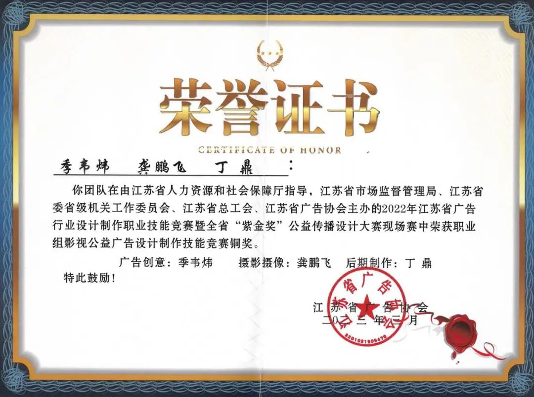 近日,由江蘇省人力資源和社會保障廳指導,江蘇省市場監(jiān)督管理局、江蘇省委省級機關(guān)工作委員會、江蘇省總工會、江蘇省廣告協(xié)會主辦的2022年江蘇省廣告行業(yè)設(shè)計制作職業(yè)技能競賽暨全省“紫金獎”公益?zhèn)鞑ピO(shè)計大賽在南京圓滿收官。鹽城港文旅集團廣告?zhèn)髅椒止緟①悎F隊現(xiàn)場創(chuàng)作的《共圓強國復(fù)興夢》短視頻作品大賽榮獲職業(yè)組影視公益廣告設(shè)計制作技能競賽銅獎。