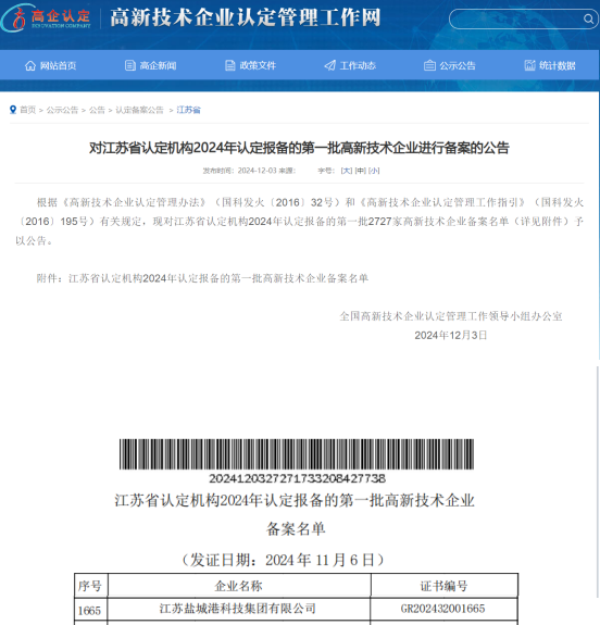 12月3日,鹽城港科技集團(tuán)成功通過“高新技術(shù)企業(yè)”認(rèn)定,提前一年完成國(guó)家高新技術(shù)企業(yè)認(rèn)定的既定目標(biāo),標(biāo)志著鹽城港集團(tuán)科技創(chuàng)新工作實(shí)現(xiàn)重大突破,邁入轉(zhuǎn)型升級(jí)新階段。