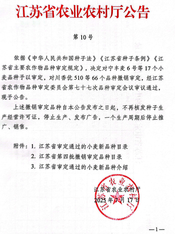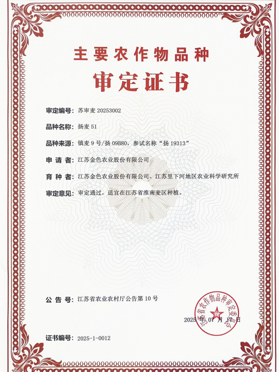 近日,江蘇省農(nóng)業(yè)農(nóng)村廳發(fā)布第10號(hào)文件公告,宣布由江蘇金色農(nóng)業(yè)股份有限公司與里下河地區(qū)農(nóng)業(yè)科學(xué)研究所聯(lián)合選育的小麥新品種“揚(yáng)麥51”正式通過江蘇省農(nóng)作物品種審定委員會(huì)的審定,審定編號(hào)為:蘇審麥20253002。