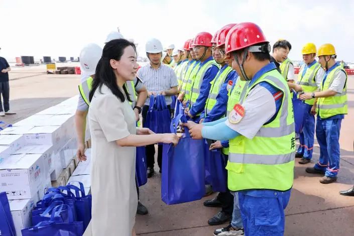 活動(dòng)現(xiàn)場(chǎng),袁欣與大家親切交談,詳細(xì)詢問一線職工的工作狀態(tài)和實(shí)際需求,對(duì)他們頂烈日、戰(zhàn)酷暑,始終堅(jiān)守崗位的敬業(yè)精神表示衷心感謝,叮囑他們要注意防暑降溫,做好個(gè)人防護(hù),并將防暑降溫“清涼禮包”送到職工代表手上。她說,當(dāng)前高溫、惡劣天氣逐漸增多,各單位要切實(shí)做好夏季防暑降溫工作,動(dòng)態(tài)調(diào)整作業(yè)時(shí)間,為廣大員工提供清涼舒心的休息場(chǎng)所,全面保障人身安全。同時(shí),要時(shí)刻繃緊安全這根弦,聚焦生產(chǎn)、消防重點(diǎn)領(lǐng)域,常態(tài)化開展安全隱患排查治理工作,做好值班值守和應(yīng)急處置,確保港區(qū)安全生產(chǎn)形勢(shì)穩(wěn)定。