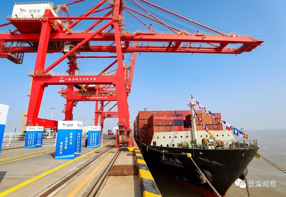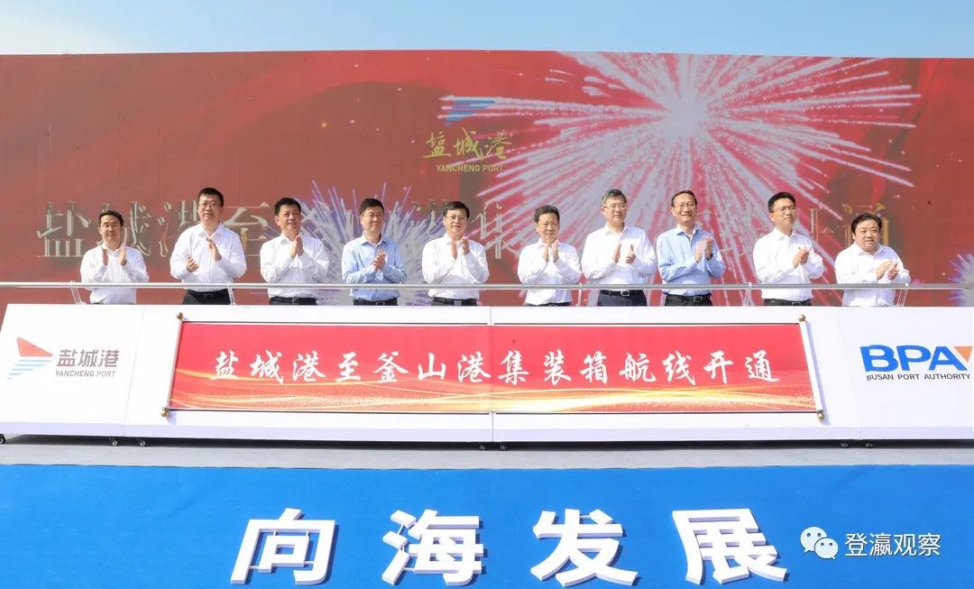 ▲鹽城港至韓國(guó)釜山港國(guó)際直達(dá)集裝箱班輪航線正式開航