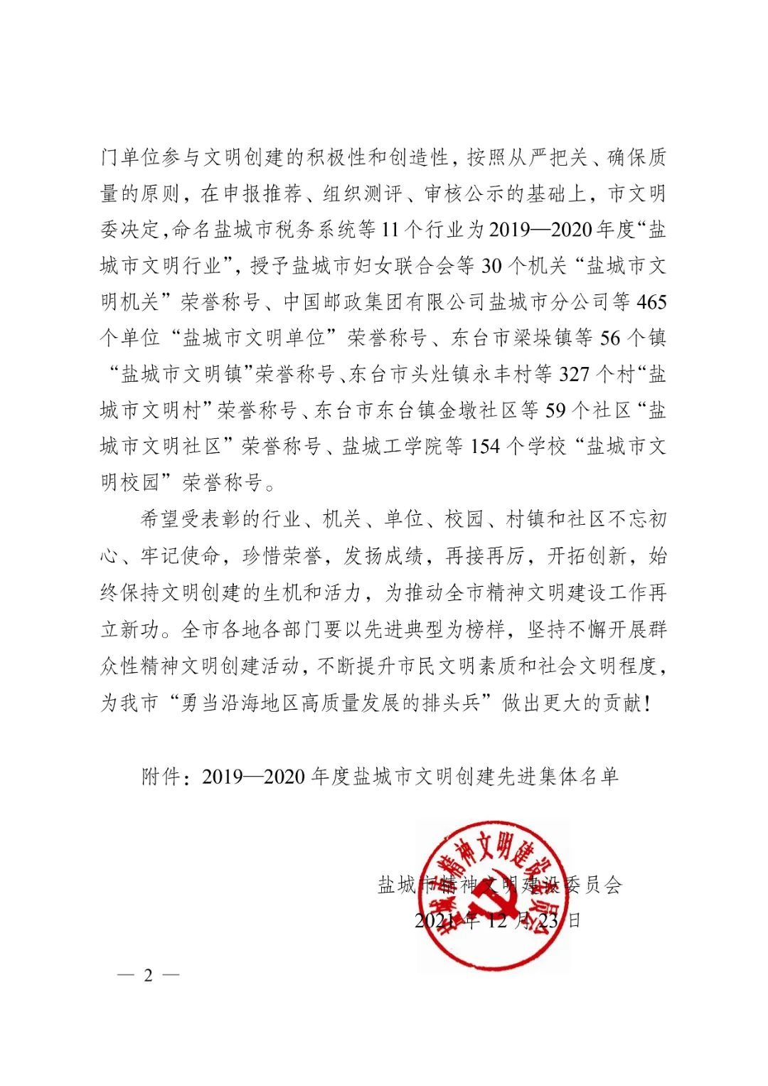 12月23日,鹽城市精神文明建設(shè)委員會(huì)發(fā)布《關(guān)于命名表彰2019-2020年度鹽城市文明創(chuàng)建先進(jìn)集體的決定》,集團(tuán)榮獲2019-2020年度“鹽城市文明單位”榮譽(yù)稱(chēng)號(hào)。