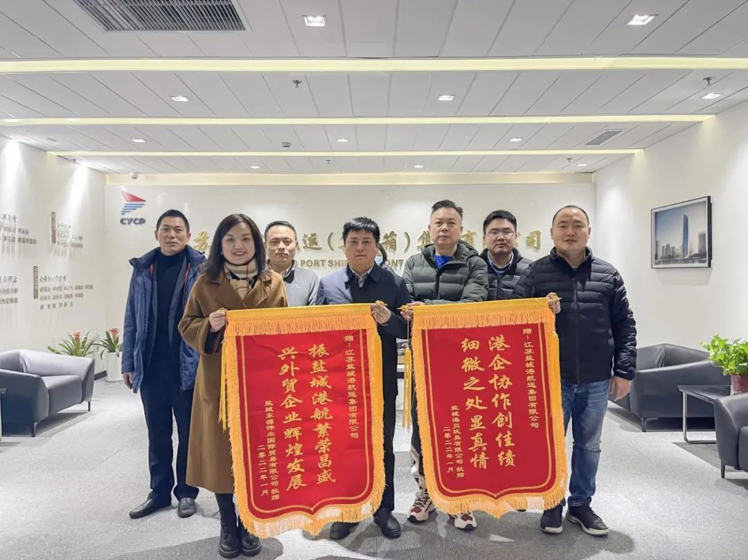 1月25日,農(nóng)歷小年這一天,南京海聆夢(mèng)、鹽城東源偉業(yè)和鹽城海貝玩具三家公司不約而同來(lái)到鹽城港航運(yùn)集團(tuán),分別將寫(xiě)有“高效服務(wù)心系企業(yè)”、“振鹽城港航繁榮昌盛,興外貿(mào)企業(yè)輝煌發(fā)展”、“港企協(xié)作創(chuàng)佳績(jī),細(xì)微之處顯真情”的錦旗送到了公司班子手中,感謝航運(yùn)集團(tuán)一年來(lái)在貨物出運(yùn)上給予的大力支持。