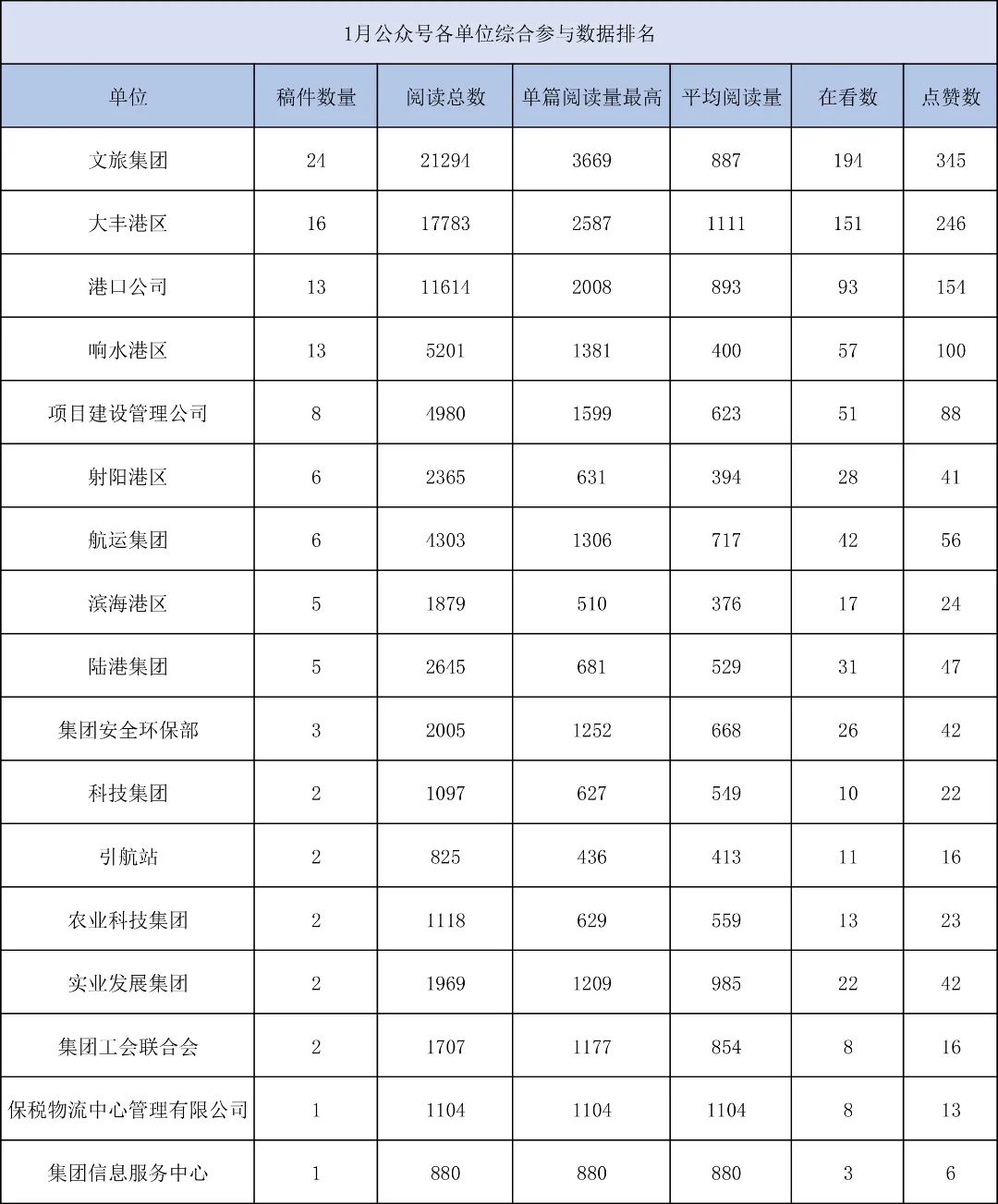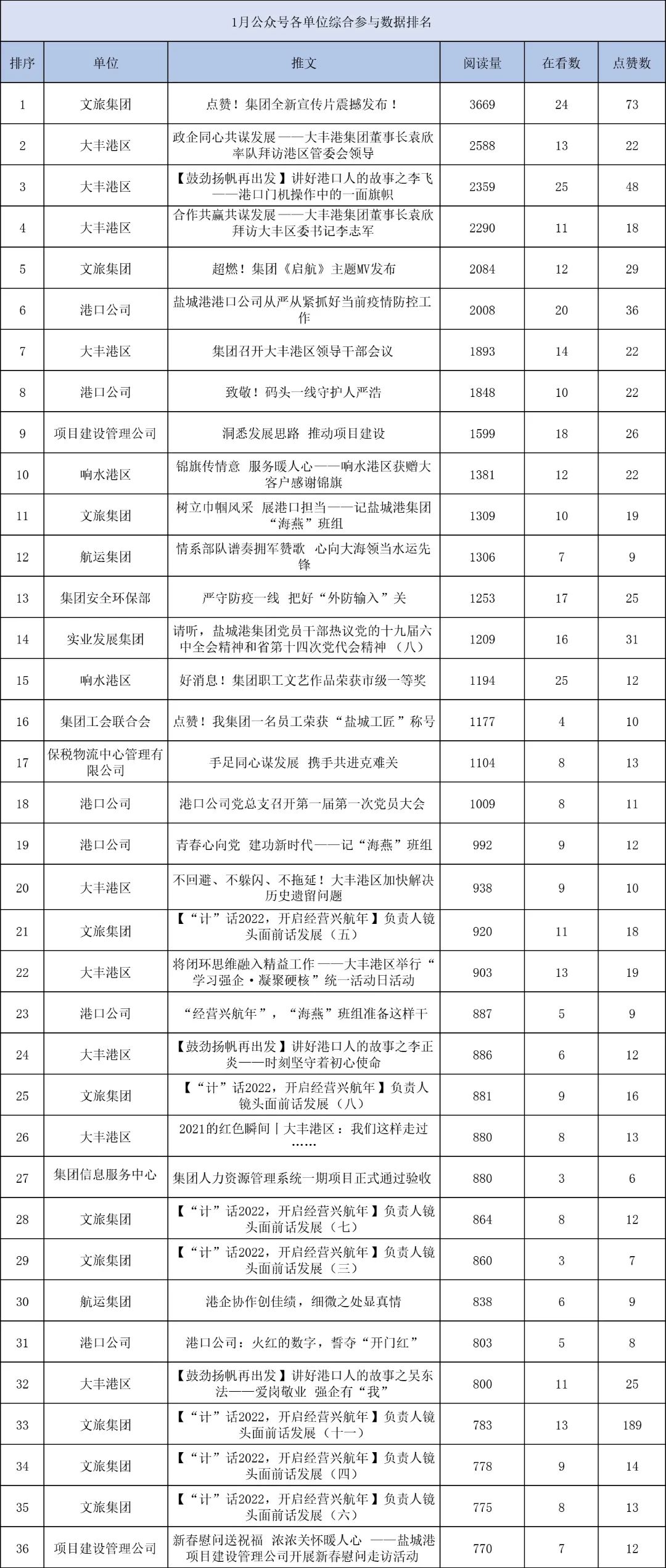 1月,“江蘇鹽城港控股集團”微信公眾號推送文章170篇,截至目前,閱讀總量14萬+,各單位供稿111篇。其中,文旅集團以2.1萬閱讀數(shù),24篇稿件量,遙遙領先;大豐港區(qū)以1.8萬閱讀數(shù),16篇稿件量,位列第二;港口公司、響水港區(qū)在供稿方面,以同樣13篇的數(shù)量并列第三,在閱讀量方面,港口公司以1.2萬的數(shù)量,位列單項第三;其他港口及板塊集團積極參與,踴躍投稿,情況較好。