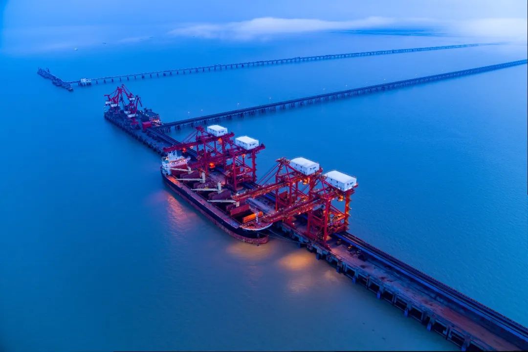海平面上,太陽冉冉升起,映紅了海面和天空,照耀著海港的迷人和神奇,新興和璀璨。