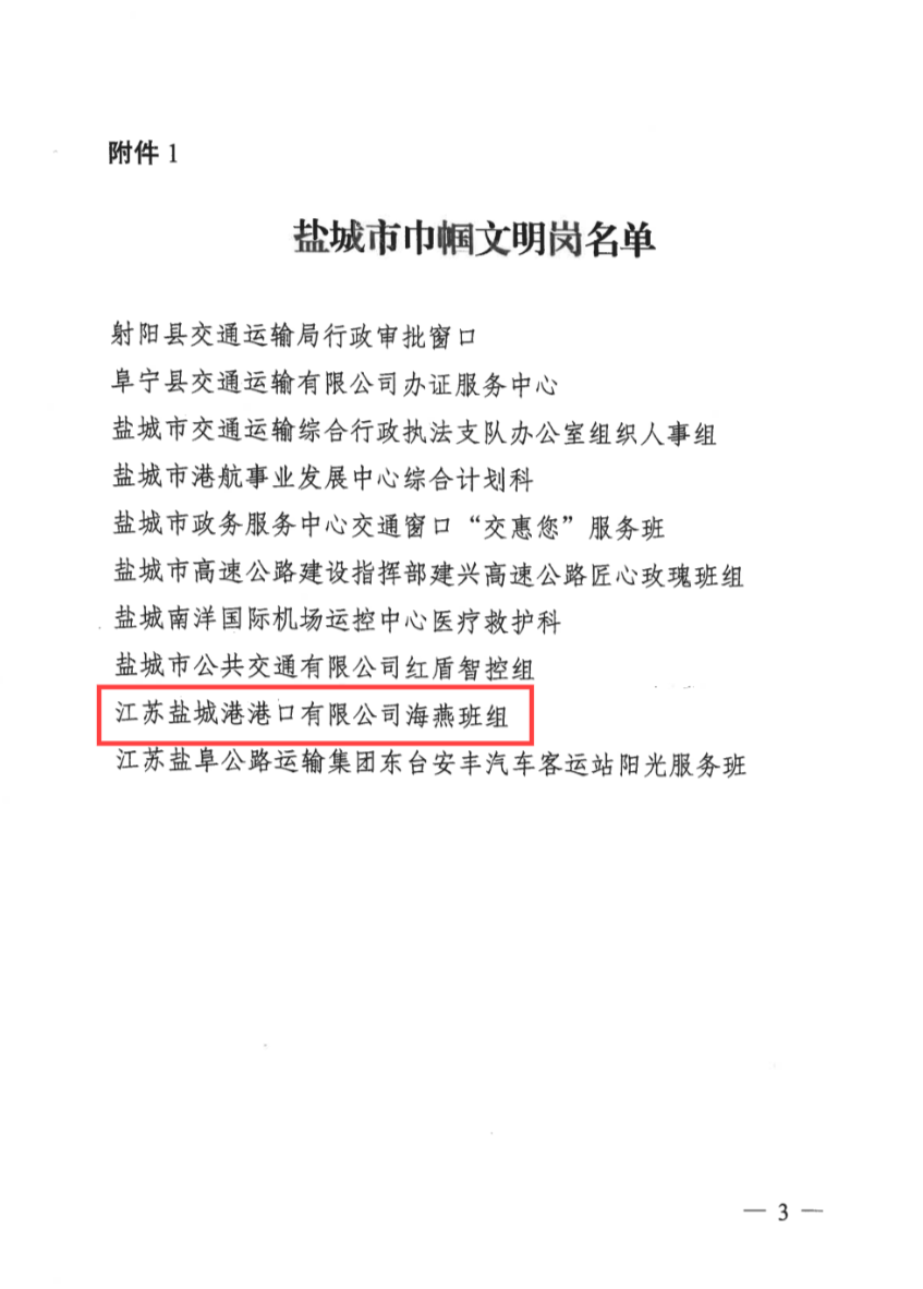 近日,市婦聯、市交通運輸局聯合發布《關于表彰全市交通運輸行業婦女崗位建功先進集體(個人)的決定》,鹽城港港口公司“海燕”班組榮獲“鹽城市巾幗文明崗”榮譽稱號。