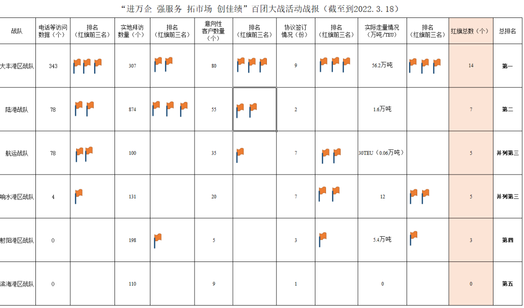 2.濱海港區戰隊:在拜訪活動中,濱海港區戰隊不僅僅局限于規上企業名單,拜訪的同時也不忘挖掘周邊有可能的企業。通過這種做法也是成功發掘一家化肥貿易企業,吞吐量50萬噸,正在商討合同條款,預計下周簽訂合同并開始走量。