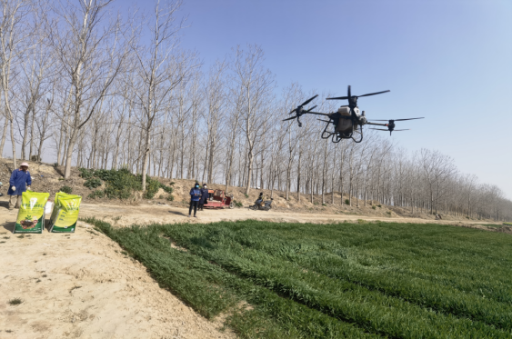 農(nóng)業(yè)集團按區(qū)域制定生產(chǎn)服務指導方案,組建“黨員志愿隊”進行志愿服務、實行區(qū)域網(wǎng)格化管理、建立微信群及時發(fā)布指導意見。為減少勞務人員聚集,提高效率,“黨員志愿隊”為種植戶提供“飛防”服務,100斤的肥料只需短短幾分鐘的時間就可以播撒完成。“網(wǎng)格員”直接到田間地頭,現(xiàn)場指導種植戶種植、病蟲害防治要點,還提供全天候“云指導”服務,確保實現(xiàn)糧食豐收。