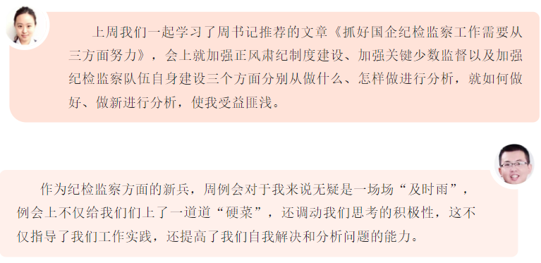 紀檢監察業務周例會是大豐港區提高紀檢條線工作能力的方式,也是建設學習型紀檢干部的有效嘗試?!皩W習要有干貨,不能搞花架子,要了解我們的干部最需要學什么,緊貼實際需求和工作要求來安排學習內容?!贝筘S港區紀檢相關負責人表示,深化監察體制改革,對紀檢監察干部的業務能力提出了更高更嚴的要求,學習就是要著力補短板、強弱項,解決紀檢監察干部本領“恐慌”問題。例會上,就集團紀委下發文件精神進行剖析、對日常監督如何抓、信息宣傳選題立意、特色亮點提煉歸納進行培訓。會上還提倡“我的問題大家答”,組織交流討論、現場解答,鼓勵善于發現問題,積極解決問題,創新理念思路,確保可以“充電補能”,提升業務能力。