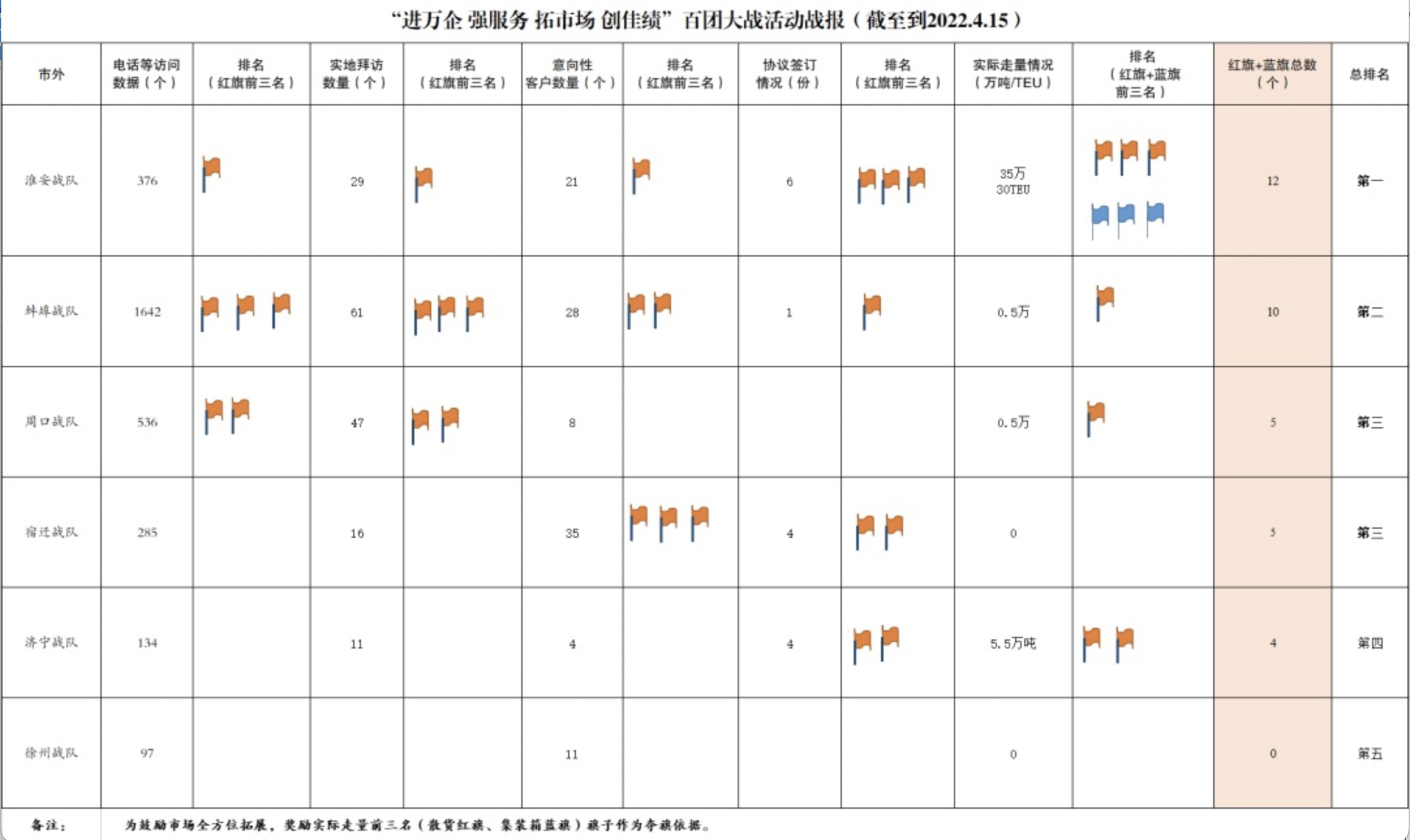各戰隊拜訪客戶11156家,其中實地拜訪客戶2564家,電話、視頻、郵件等方式拜訪8592家,其中意向客戶445家,協議簽訂109份(其中云簽約19份),實際走量244.69萬噸(其中云簽約10萬噸),集裝箱1854TEU(其中云簽約153TEU)。