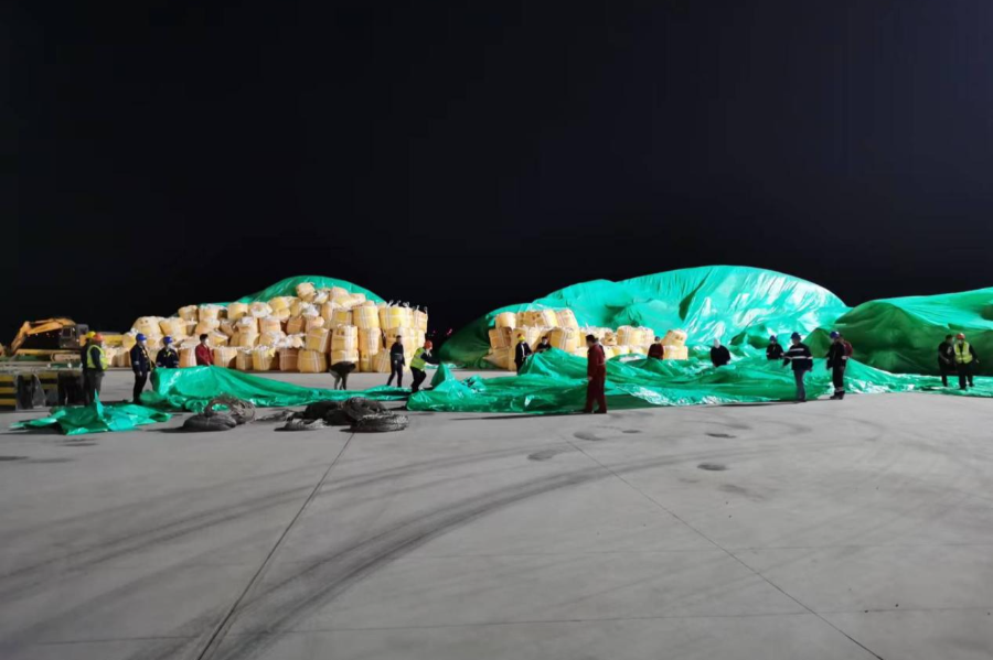 雖然該輪采用客戶自行裝卸模式,響水港區(qū)在接到客戶求助后,沒有絲毫推脫責任,本著任何一個來港客戶都是我們服務對象的工作意識,迅速組織人員隊伍和物資投入到了貨物苫蓋搶險中,及時從港內物資倉庫調劑了一千多平方的防雨布,同時調集港內近20名員工參與苫蓋搶險。為確保各個環(huán)節(jié)迅速、高效,港區(qū)生產、市場等部門同志全部親臨一線溝通協(xié)調,經過近8小時的奮戰(zhàn),一直到次日凌晨2點左右,苫蓋基本結束,客戶懸著的心終于落地,并對港區(qū)的服務再三表示感謝。考慮到夜間視線不清等因素,27日天亮后,生產部門管理人員再次對碼頭苫蓋質量進行了檢查,對靠海側安排人員進行了再加固,確保了碼頭所有貨物不被雨水淋濕。
