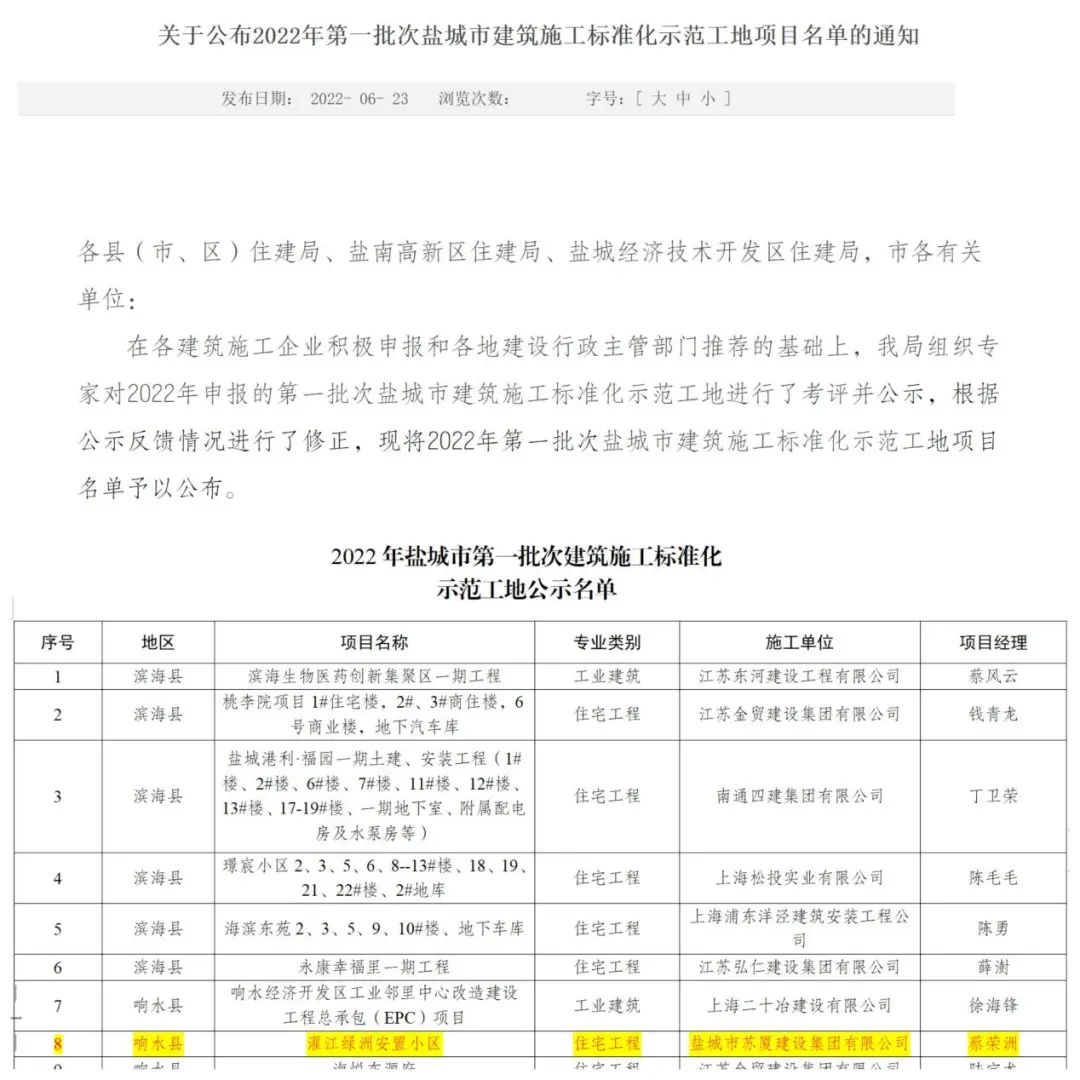 日前,江蘇省鹽城市住房和城鄉(xiāng)建設(shè)局公布2022年第一批次鹽城市建筑施工標(biāo)準(zhǔn)化示范工地項(xiàng)目名單,由項(xiàng)目管理公司代管的響水縣灌江綠洲安置小區(qū)項(xiàng)目榮獲“鹽城市建筑施工標(biāo)準(zhǔn)化示范工地”稱號(hào)。