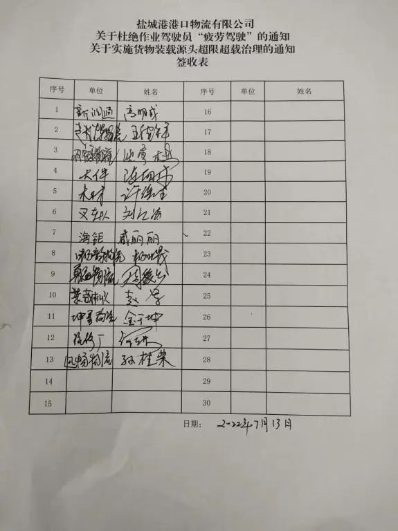 為全面做好港區(qū)作業(yè)車輛超限超載治理工作,切實(shí)加大貨運(yùn)源頭治理力度,保障道路交通運(yùn)輸安全。近期,鹽城港港口公司物流公司認(rèn)真組織職工學(xué)習(xí)貫徹國務(wù)院安委會安全生產(chǎn)“十五條”硬措施和鹽城港集團(tuán)“三位一體”工作部署要求,堅(jiān)持“人民至上,生命至上”的理念,嚴(yán)格落實(shí)《關(guān)于實(shí)施貨物裝載源頭超限超載的通知》、《關(guān)于杜絕作業(yè)駕駛員“疲勞駕駛”的通知》等文件要求,全力開展安全運(yùn)輸“三步走”工作。