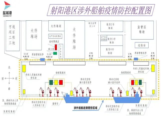 練內(nèi)功,行穩(wěn)筑基“守”規(guī)范。港區(qū)全面貫徹落實(shí)水路口岸疫情防控管理規(guī)定,嚴(yán)格按照涉外碼頭防控標(biāo)準(zhǔn),扎實(shí)推動(dòng)碼頭設(shè)備設(shè)施改造升級(jí)。港區(qū)根據(jù)水路口岸防控組審定的“射陽港區(qū)涉外船舶疫情防控配置圖”,改造完成了碼頭“三區(qū)兩通道”、“登輪人員梯口值守崗?fù)ぁ薄ⅰ敖缑婀芾韻復(fù)ぁ钡扔布O(shè)施,擴(kuò)展提升了自有監(jiān)控覆蓋范圍,為射陽港區(qū)口岸對(duì)外開放后的涉外船舶“三位一體”管理工作打下堅(jiān)實(shí)基礎(chǔ)。