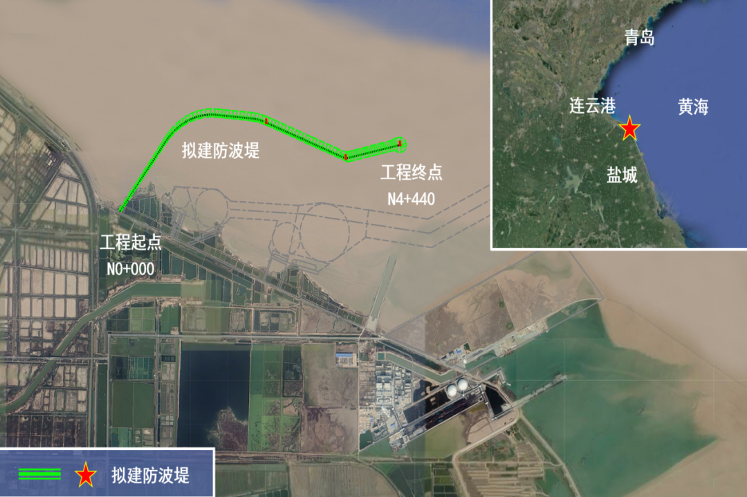 鹽城港濱海港區北港池防波堤一期工程位于濱海港區規劃北港池水域,防波堤與既有防潮大堤相接,接岸點位于蝦須港閘東側約1km處。工程全長4440m,分為陸上施工和海上施工兩個部分。
