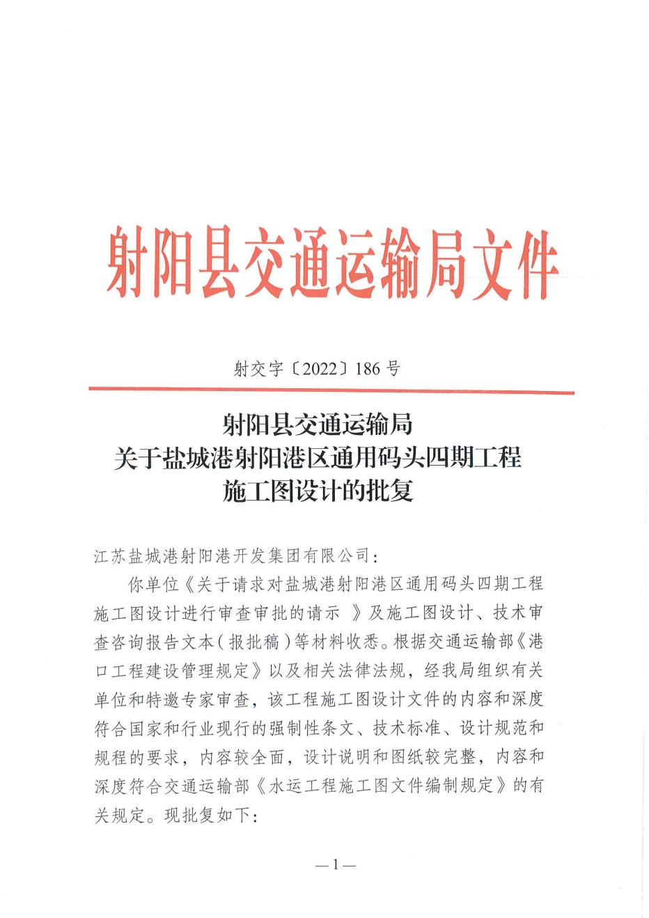 8月30日,鹽城港射陽港區(qū)通用碼頭四期工程項(xiàng)目初步設(shè)計(jì)和施工圖設(shè)計(jì)取得正式批復(fù)。至此,該項(xiàng)目已完成所有前期手續(xù),為項(xiàng)目的正式開工奠定了堅(jiān)實(shí)的基礎(chǔ)。