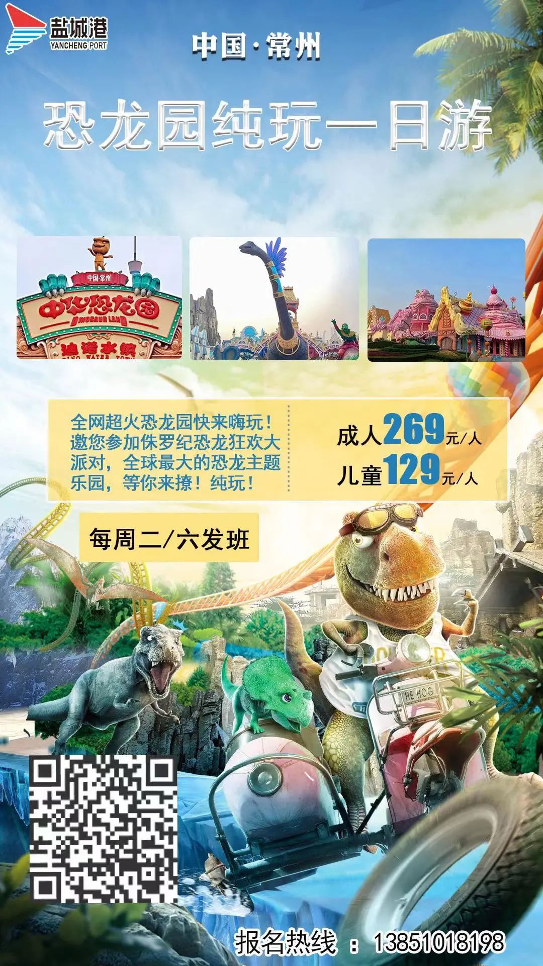 為充分發揮常州、鹽城兩地的旅游優勢,拓展常鹽合作空間和領域,港泊旅行社分公司本周首推常州恐龍園純玩一日游、常州恐龍園淹城動物園親子2日游,超刺激的4D過山車,大海嘯,帶你探索恐龍的神秘家園;還可以近距離接觸200多種10000多頭動物,森林大馬戲等表演,領略一場視覺和聽覺的盛宴。