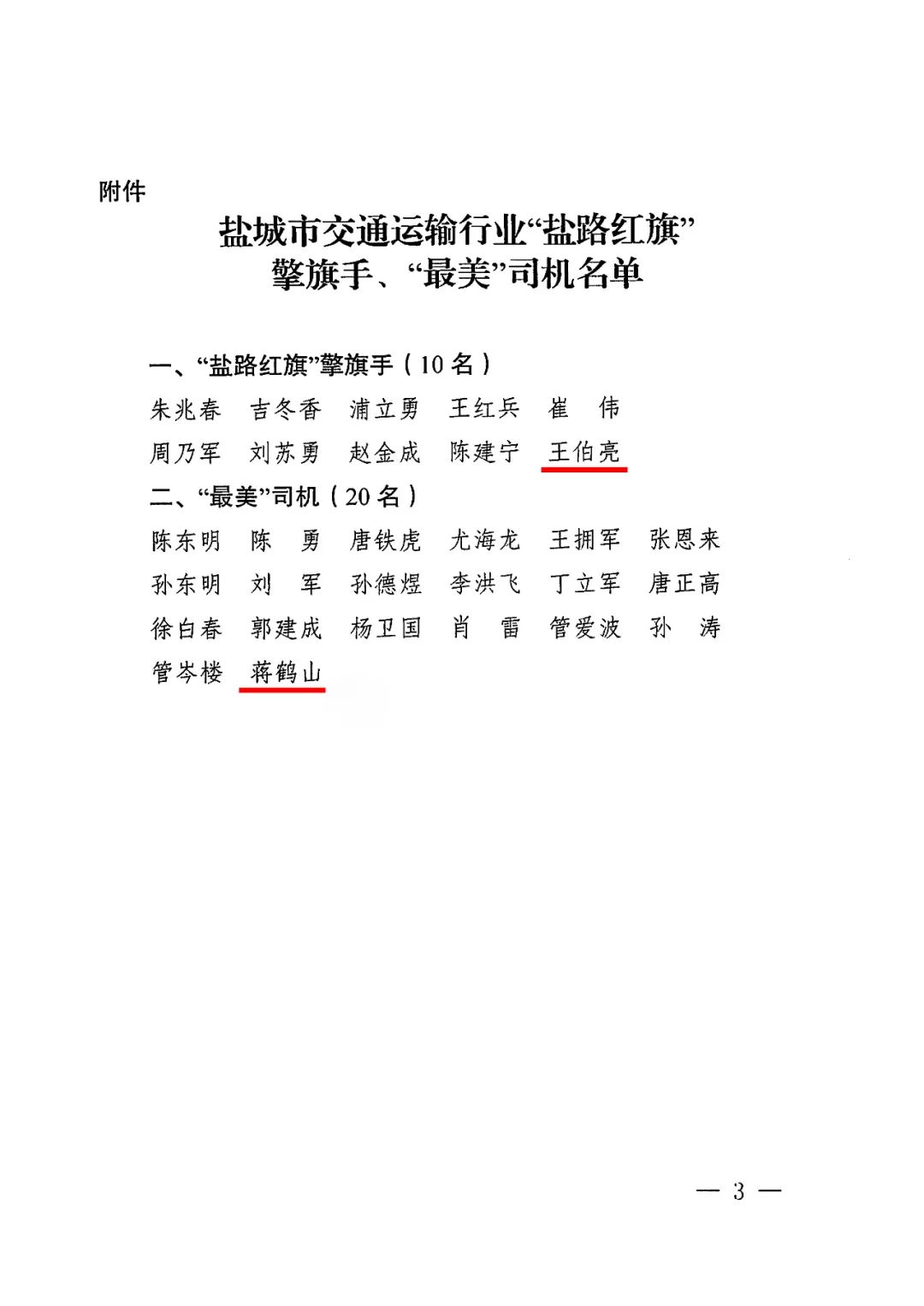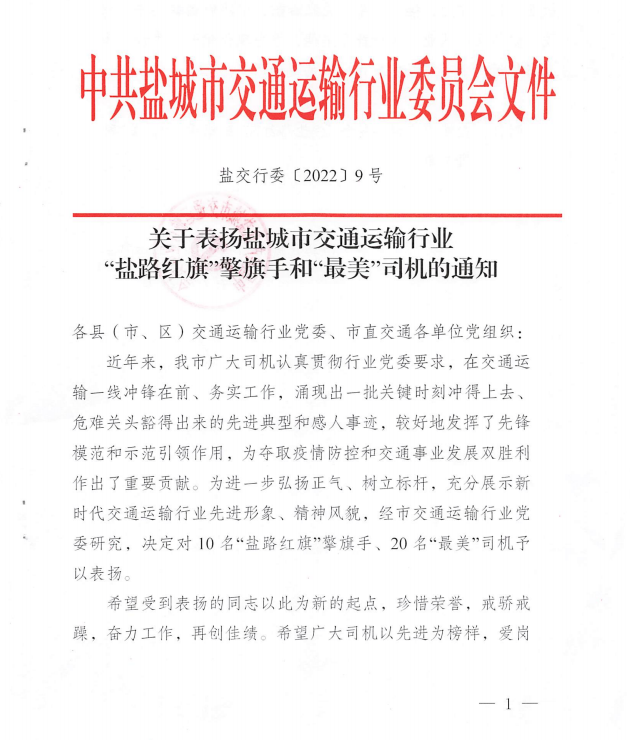 近日,中共鹽城市交通運輸行業(yè)委員會印發(fā)《關(guān)于表揚鹽城市交通運輸行業(yè)“鹽路紅旗”擎旗手和“最美”司機的通知》,集團大豐港區(qū)王伯亮榮獲“鹽路紅旗”擎旗手榮譽稱號,集團響水港區(qū)蔣鶴山榮獲“最美”司機榮譽稱號。