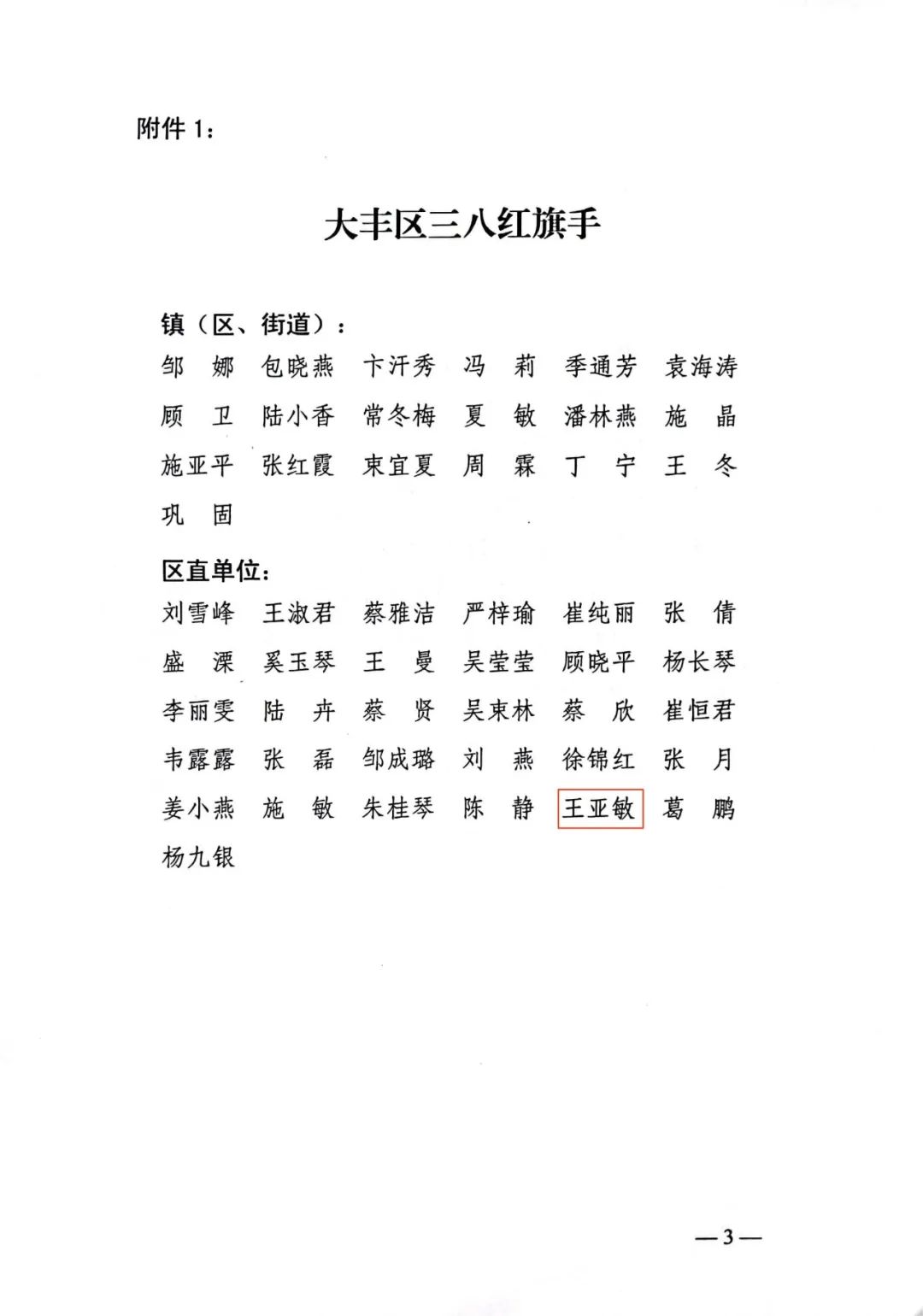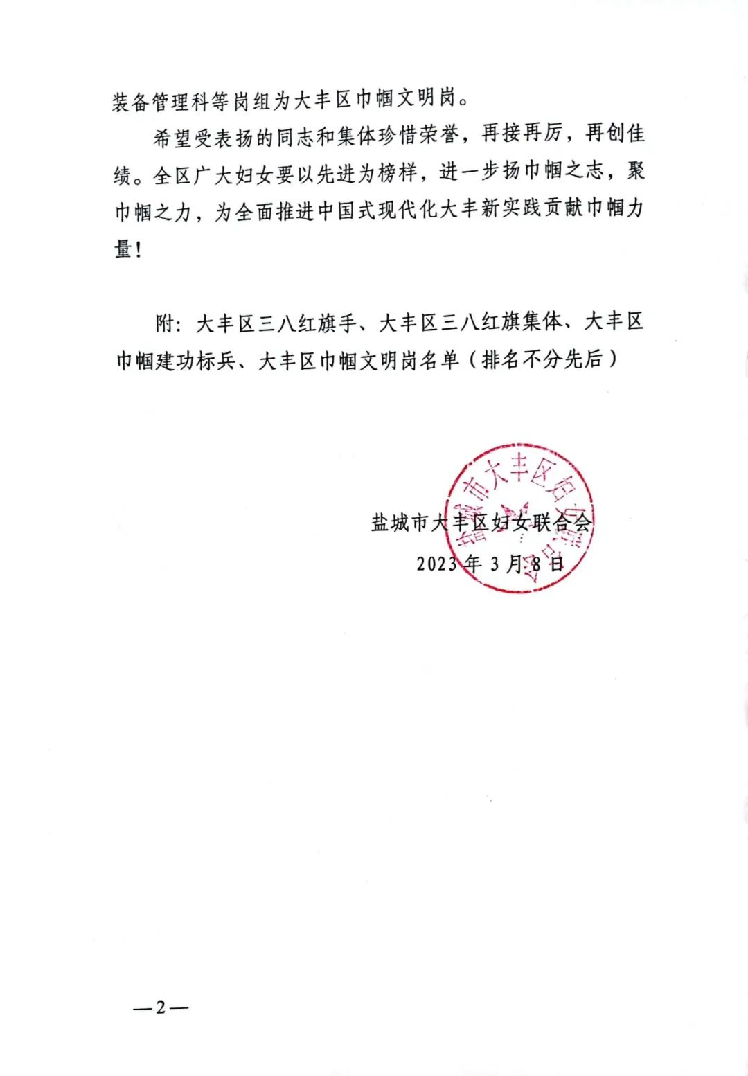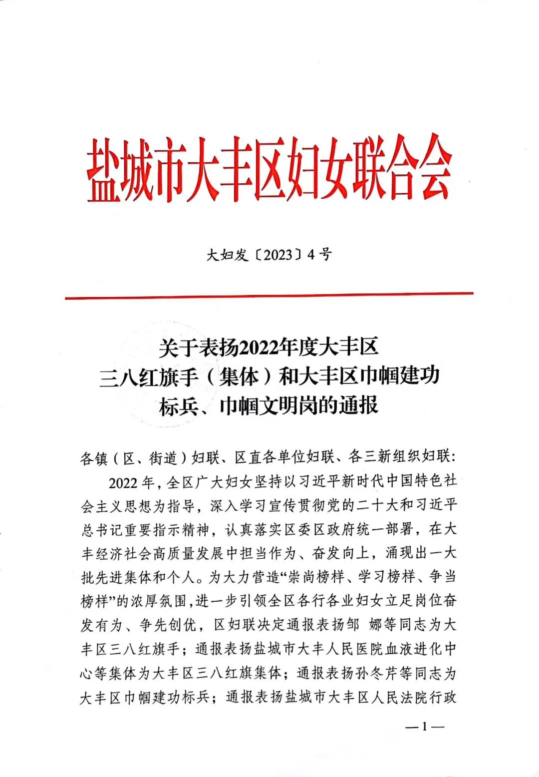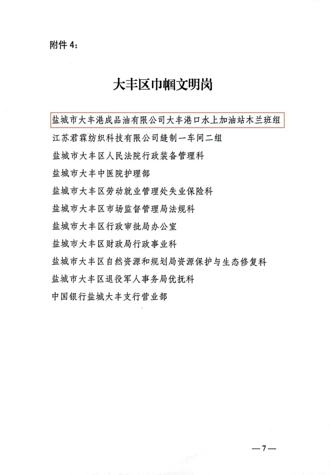 近日,大豐區(qū)婦女聯(lián)合會(huì)發(fā)表《關(guān)于表?yè)P(yáng)2022年度大豐區(qū)三八紅旗手(集體)和大豐區(qū)巾幗建功標(biāo)兵、巾幗文明崗的通報(bào)》,鹽城港大豐港區(qū)成品油公司水上加油站“木蘭”班組榮獲“巾幗文明崗”榮譽(yù)稱號(hào),班組成員王亞敏榮獲“三八紅旗手”榮譽(yù)稱號(hào)。