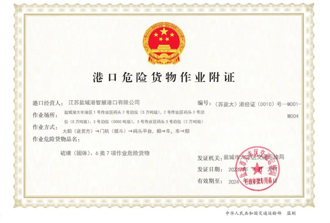 三周年·百日行丨鹽城港大豐港區集裝箱碼頭取得港口危險貨物作業附證