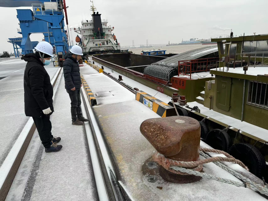 響水港區啟動氣象災害 (道路結冰、寒潮、暴雪)應急響應,對靠泊碼頭的船舶、設備防風工作作出周密部署和安排。對機械設備防風裝置及風速儀等設施進行逐一排查,切實做好大型設備標準防風工作;對靠港船舶檢查防滑網、扶手繩等,并要求全部船舶按照規范要求系泊纜繩;對變電所、箱變、輸電線路等設施進行了統一檢查,排除用電安全隱患,全方位保障生產安全穩定。