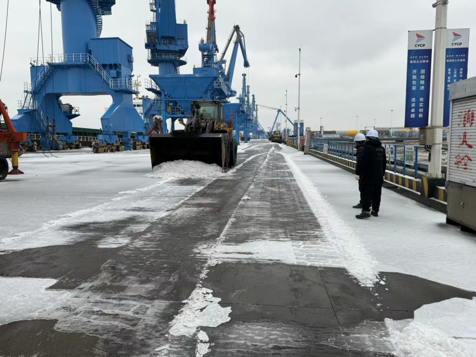 為排除現場積雪,防止道路結冰帶來的安全隱患,響水港區采取“機械+人工”協同作業模式,對港區重點區域、主要道路和交通要道等進行清掃,同時根據道路積雪情況,適時組織拋撒融雪劑,全力以赴保障港區道路暢通及職工出行安全。