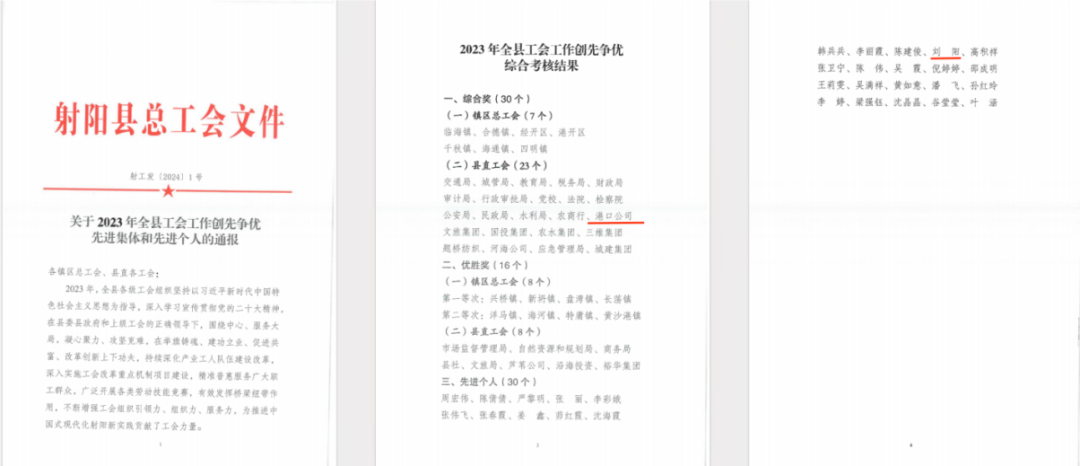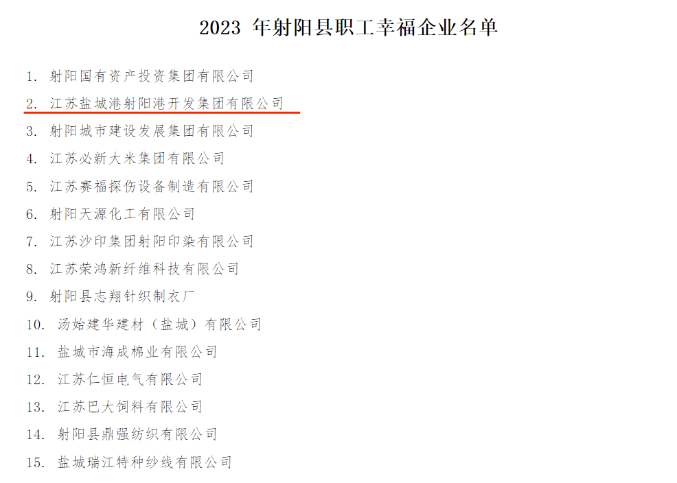 近日,射陽縣總工會公示了2023年射陽縣“職工幸福企業”名單、縣工會工作爭先創優綜合考核結果,射陽港開發集團榜上有名,再獲新榮譽。