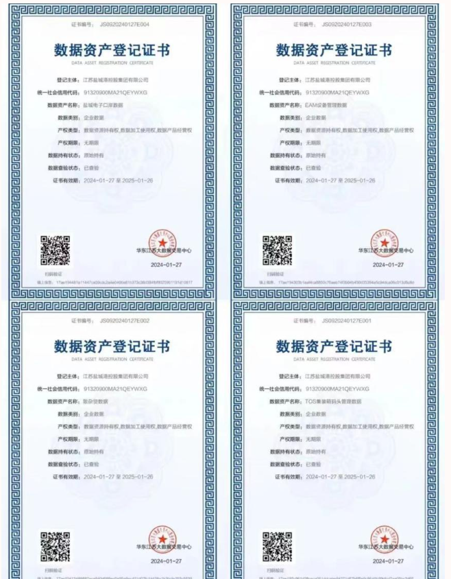 2024年,科技集團按照鹽城港集團黨委決策部署,緊緊圍繞集團“合規管理年”“提質增效年”活動主題,順利完成集裝箱碼頭生產操作系統(TOS)、電子口岸系統、港機設備物資管理系統(EAM)、散雜貨生產管理系統(MES)數據資產質量評價及價值評估,并獲得《數據資產登記證書》,數據價值總計評估為4000多萬元,力奪科技創新首季“開門紅”。