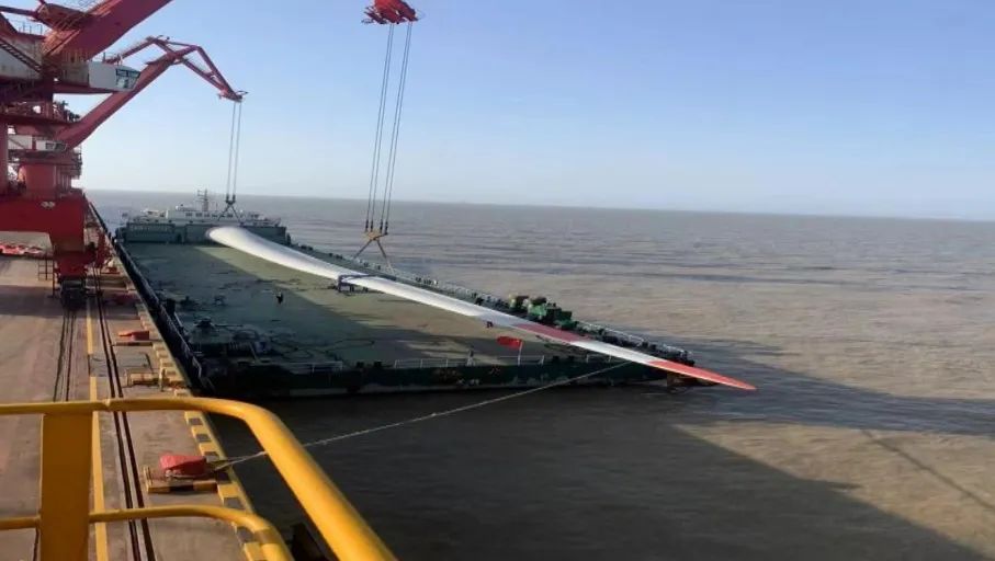 近日,在鹽城港大豐港區(qū)通用碼頭2#泊位上演了一場風電葉片的吊裝大片。兩套116米巨龍般的風電葉片,隨著吊裝繩索穩(wěn)穩(wěn)吊放在“盛達98”輪甲板上,標志著本次風電葉片作業(yè)任務順利完成,起航運往廣西防城港。