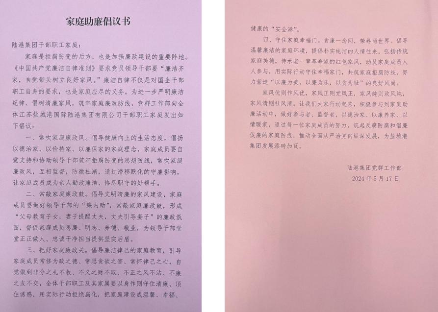 家庭齊心助廉。“為進一步嚴明廉潔紀律、筑牢家庭廉政防線,黨群工作部向全體陸港集團干部職工家庭發(fā)出如下倡議……”在警示教育大會上,陸港集團黨群工作部向全體干部職工發(fā)出了《家庭助廉倡議書》,引導干部職工家屬常吹“家庭廉潔風”,做好“家庭廉內(nèi)助”,把好“家庭廉潔門”,以清廉家風抵御腐敗歪風,齊心協(xié)力,共同織密“家庭護廉網(wǎng)”。