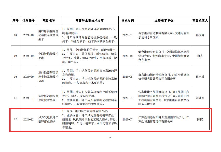根據中國港口協會中港協行函〔2024〕30號文件精神,江蘇鹽城港射陽港開發集團有限公司申報的《風力發電機港口裝卸作業要求》成功通過《2024年度中國港口協會團體標準化計劃》立項,這標志著鹽城港港口風力發電機裝卸作業將作為行業標準在港口作業行業進行推廣。