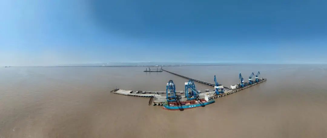 堆場上,堆積如山的集裝箱在秋陽的映照下,閃耀著迷人的光澤。碼頭門機忙碌地吊運著,與秋天的寧靜形成了鮮明的對比。
