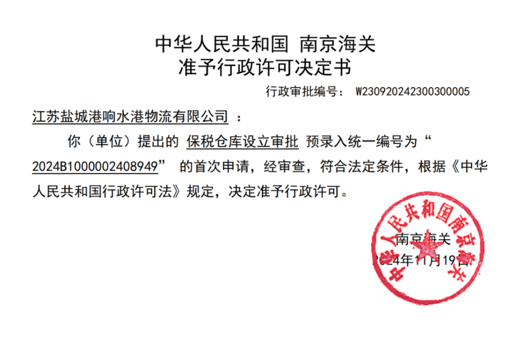 經(jīng)過(guò)一系列申報(bào)、審批流程,響水港物流有限公司公用型保稅倉(cāng)成功獲得南京海關(guān)的行政許可,并于12月2日下發(fā)行政許可決定書(shū)。標(biāo)志著響水地區(qū)首個(gè)“公用型保稅倉(cāng)庫(kù)”正式批準(zhǔn)設(shè)立。
