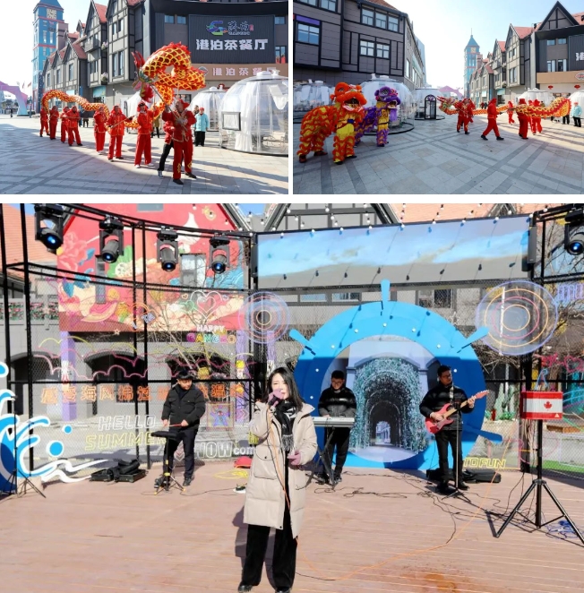 一踏入莎士比亞商貿小鎮,港泊系列餐飲門店、跨境電商門店都洋溢著濃濃的年味。紅燈籠高高懸掛,彩旗隨風飄揚,喜慶的對聯貼滿門窗,瞬間將人們帶入春節的喜慶氛圍中。舞龍舞獅表演無疑是小鎮的重頭戲,廣場上,舞龍在燈火的映照下蜿蜒舞動,身姿矯健,色彩斑斕,時而騰空而起,時而盤旋游走,氣勢磅礴,引得觀眾陣陣驚呼。舞獅表演同樣精彩絕倫,獅子們眼神靈動,表情豐富,時而翻滾跳躍,時而嬉戲玩耍,為觀眾帶來無盡的歡樂與好運。
